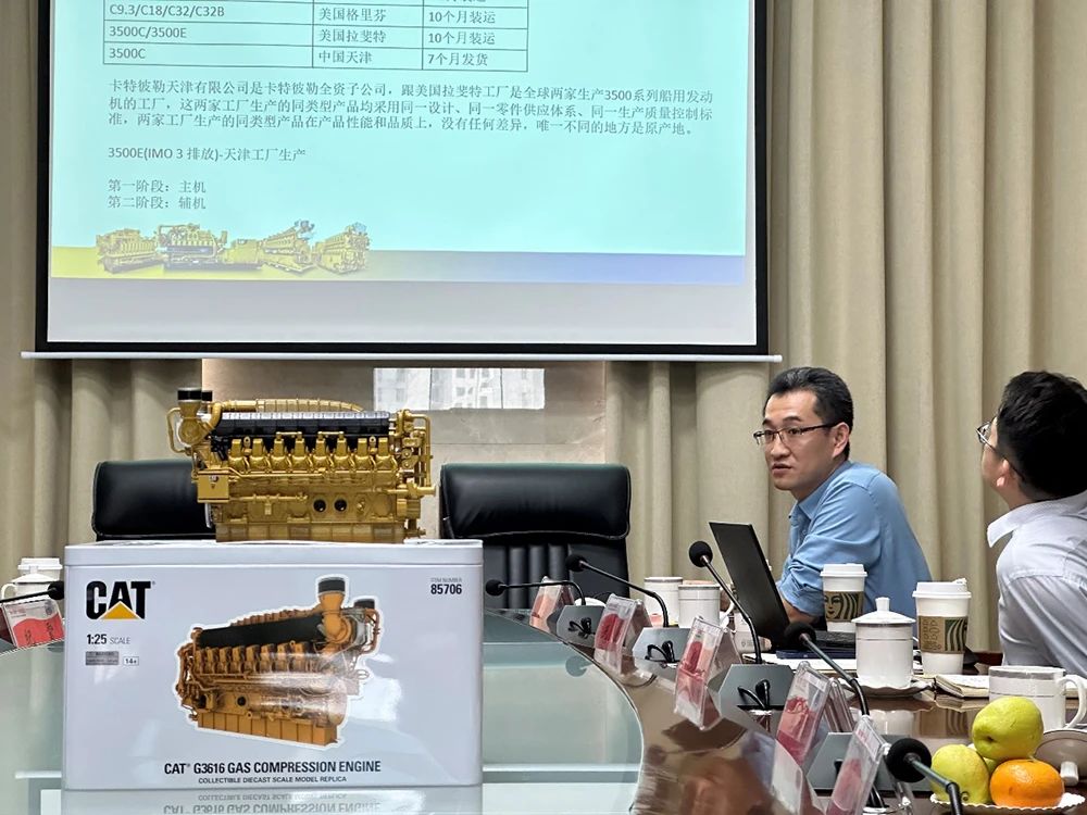 会议进行过程中,710公海寰宇船机销售经理翟宏强先生针对镇江船厂尤为关注的 CAT 发电机组生产周期的优化以及产品证书的完善等问题,给予了详尽的解答。无独有偶,船机资深应用经理戎恺先生也慷慨分享了 CAT 的最新产品以及研发进度。