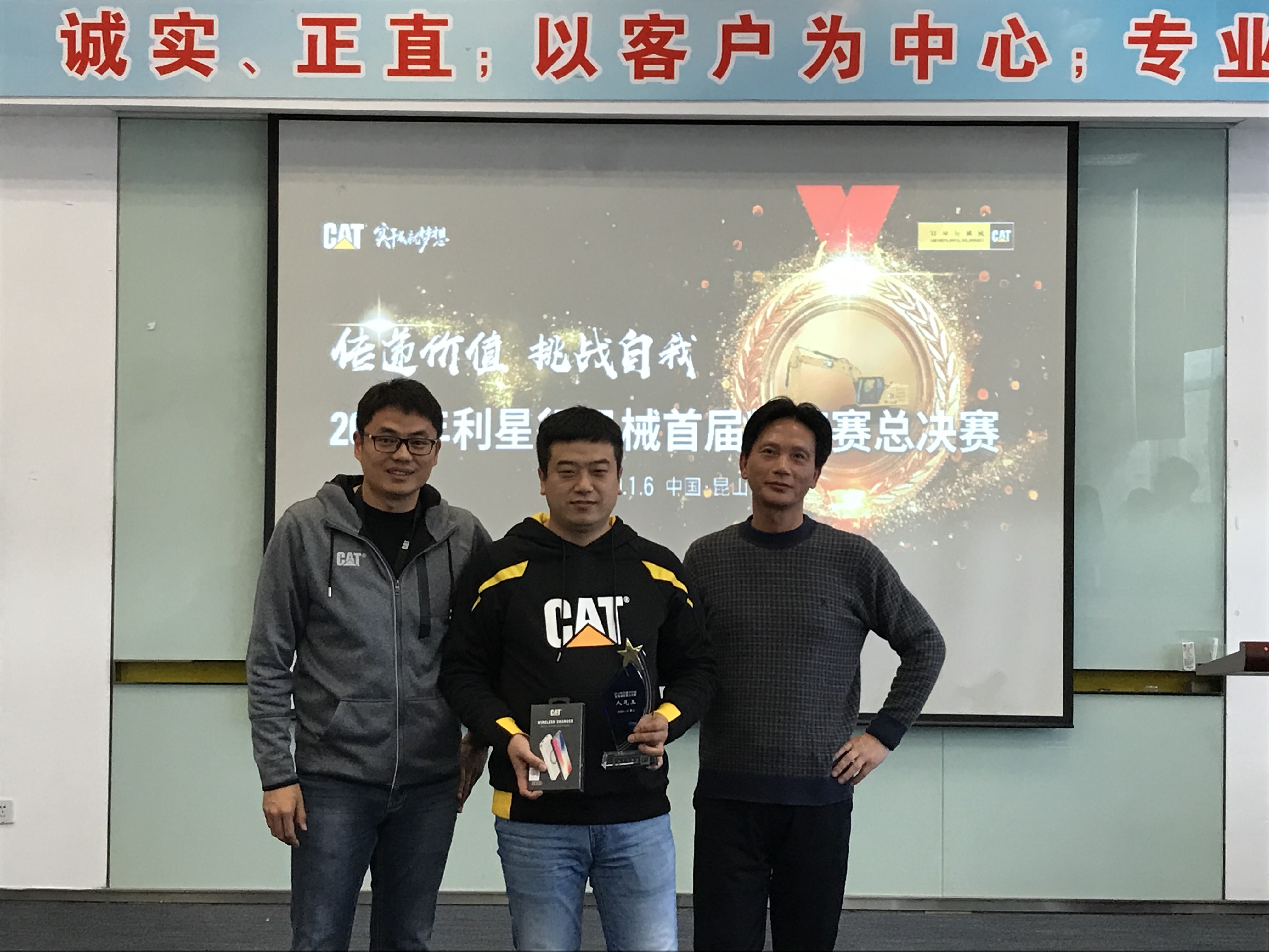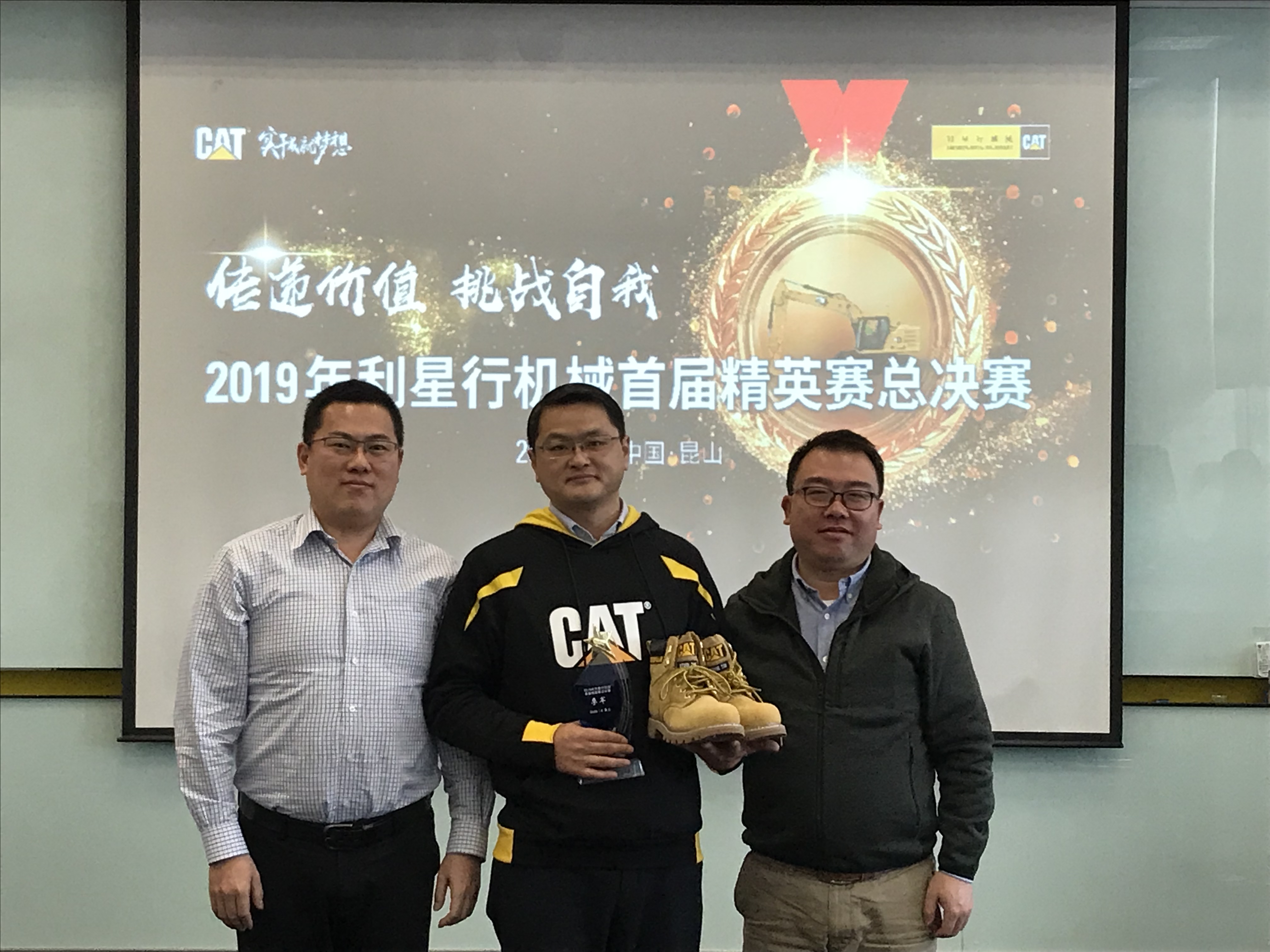 现场比赛季军获得者:安徽靳朝中,奖品:卡特大黄靴,大赛评委桑子博(卡特彼勒BCP产品经理)及解军(卡特彼勒GCI 产品经理)进行了颁奖。