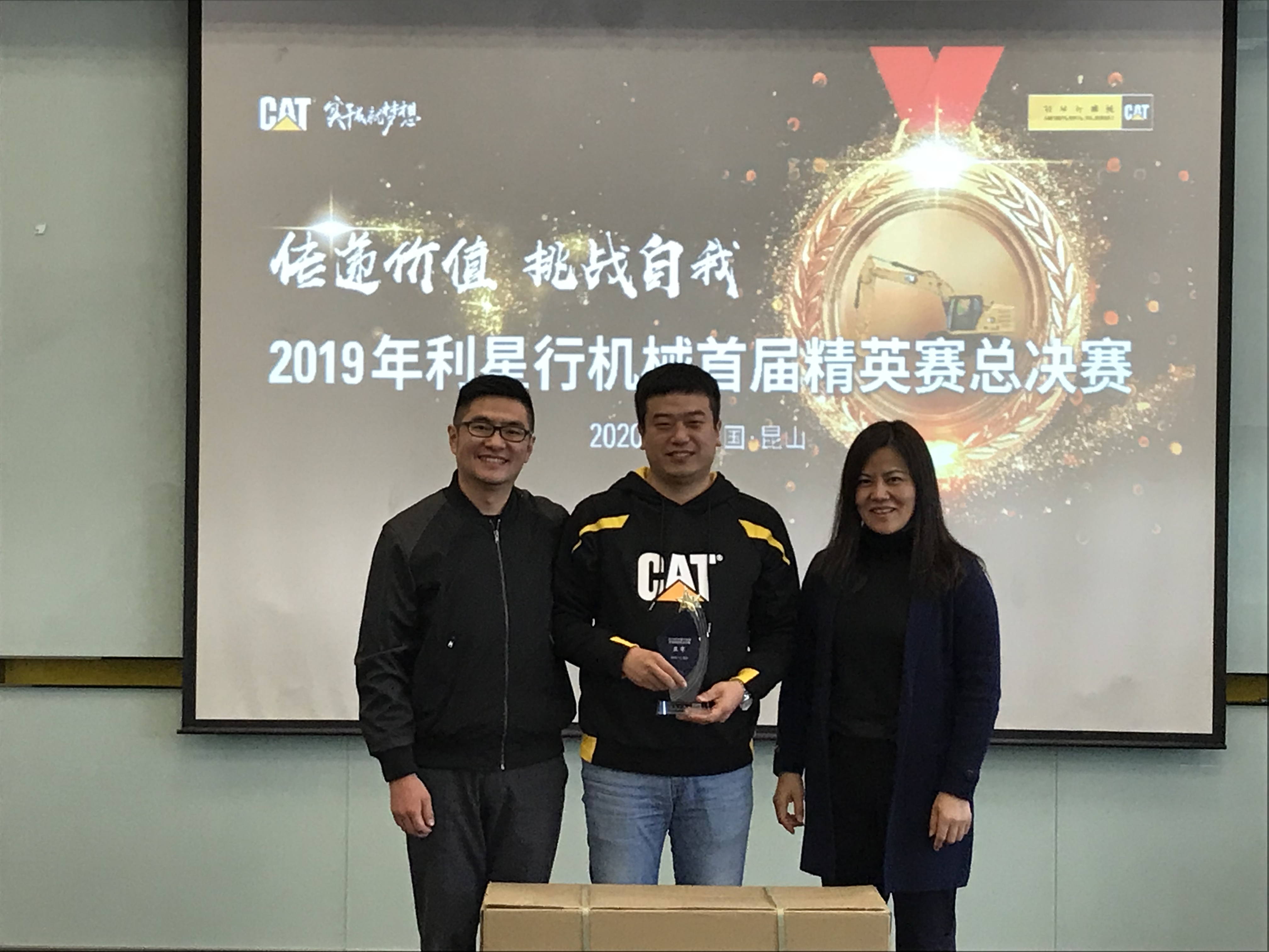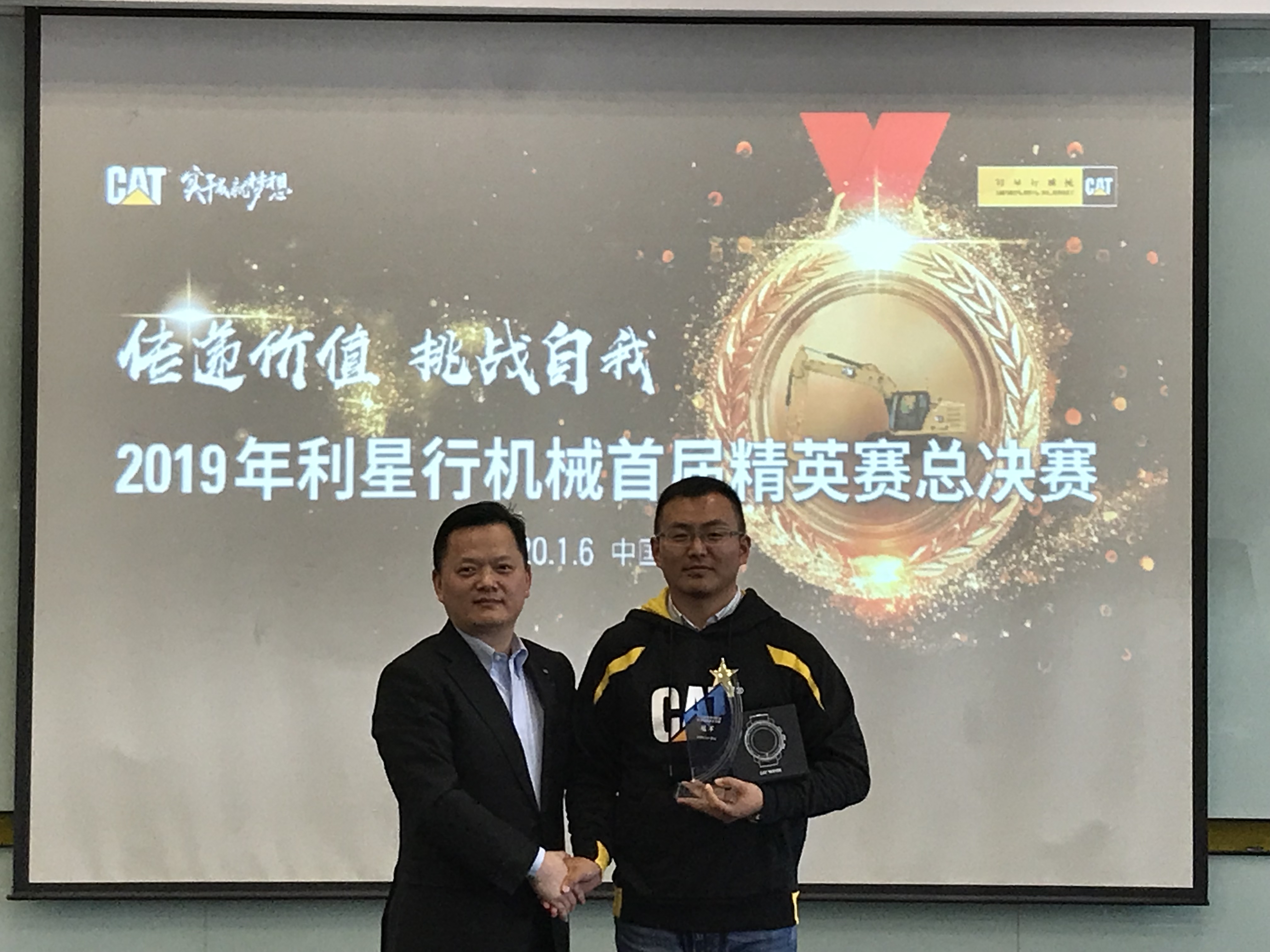 现场比赛亚军获得者:湖北沙玉玺,奖品:定制自行车,由赛评委姚振兴(卡特彼勒GCI产品经理)及市场部总经理Fiona Zhu为他颁奖。