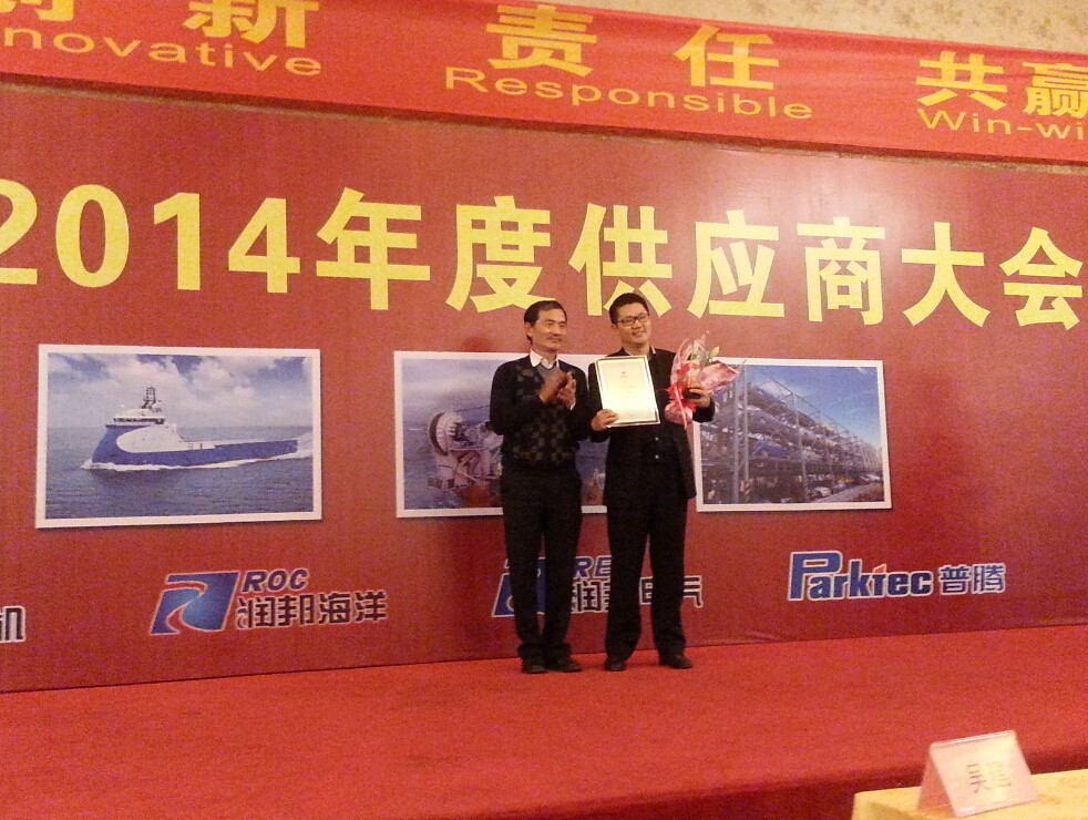 新年伊始,南通润邦海洋工程装备有限公司2014年度供应商大会在江苏南通隆重举行,来自全国各地的150家供应商二百余名代表, 润邦股份董事长、总裁及相关负责人参加了此次盛会。在当晚最受瞩目的2014年度优秀供应商颁奖环节,710公海寰宇机械(上海)有限公司不负众望地获得了南通润邦海洋工程装备有限公司“2014年度优秀供应商”荣誉称号,710公海寰宇船舶动力部销售总经理洪波先生代表公司接受了这份荣誉并对进一步加强双方合作和共同捕捉商业机会进行了展望。