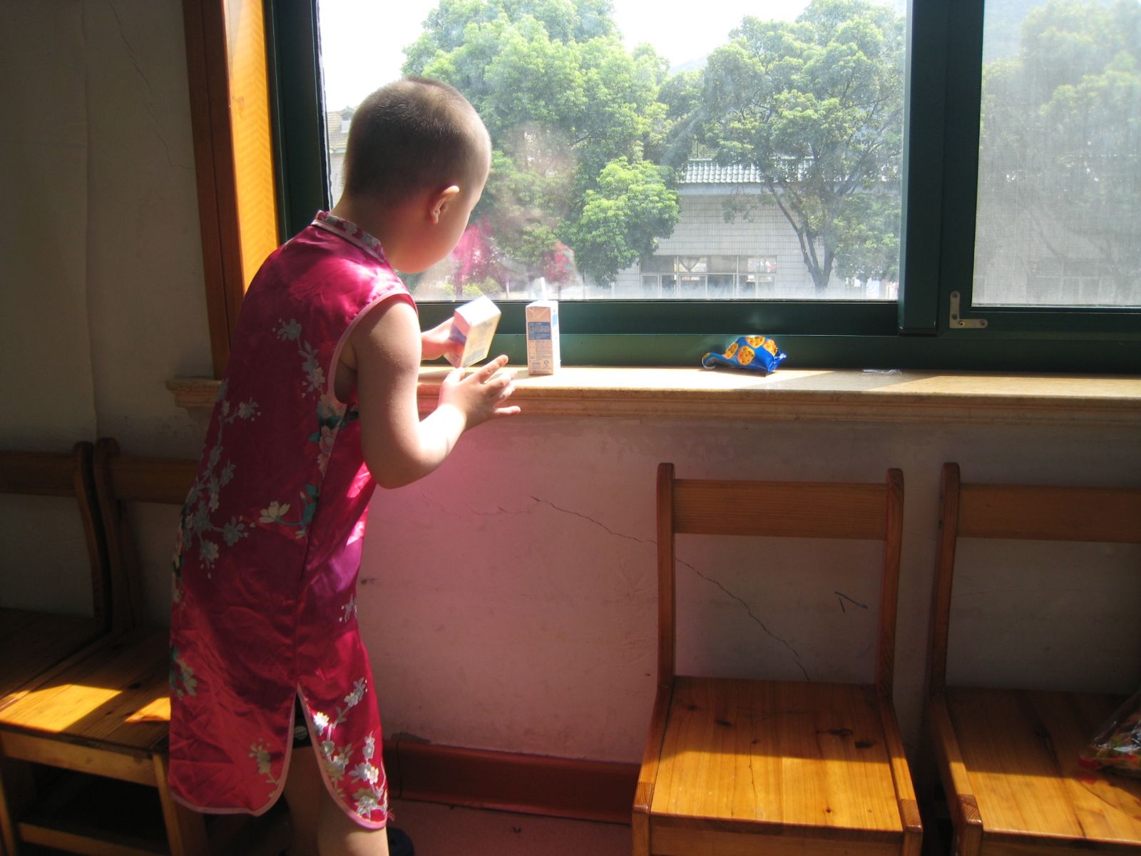 站在窗台前面的小女孩,皮肤白皙,性格安静,穿着玫红的旗袍,很漂亮!她并不想主动的靠近我们,拿着发到的饼干和牛奶,默默的走到窗台前,窗外阳光炽热,孩子的眼神清澈,闪动着单纯的光,只愿有更多的人愿意花一点点时间专门陪她玩一玩,聊聊天,给她一个关怀的微笑和拥抱。