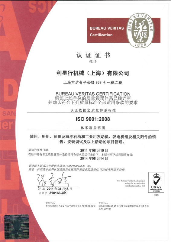 710公海寰宇机械获得ISO9001:2008认证的产品包括:陆用,船用,油田及海洋石油和工业用发动机,发电机组及相关附件的销售,安装调试及以上活动的项目管理。