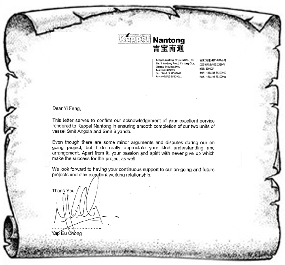 一封来自吉宝南通船厂的感谢信